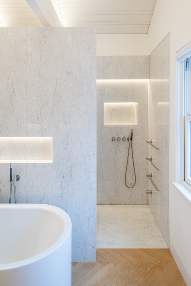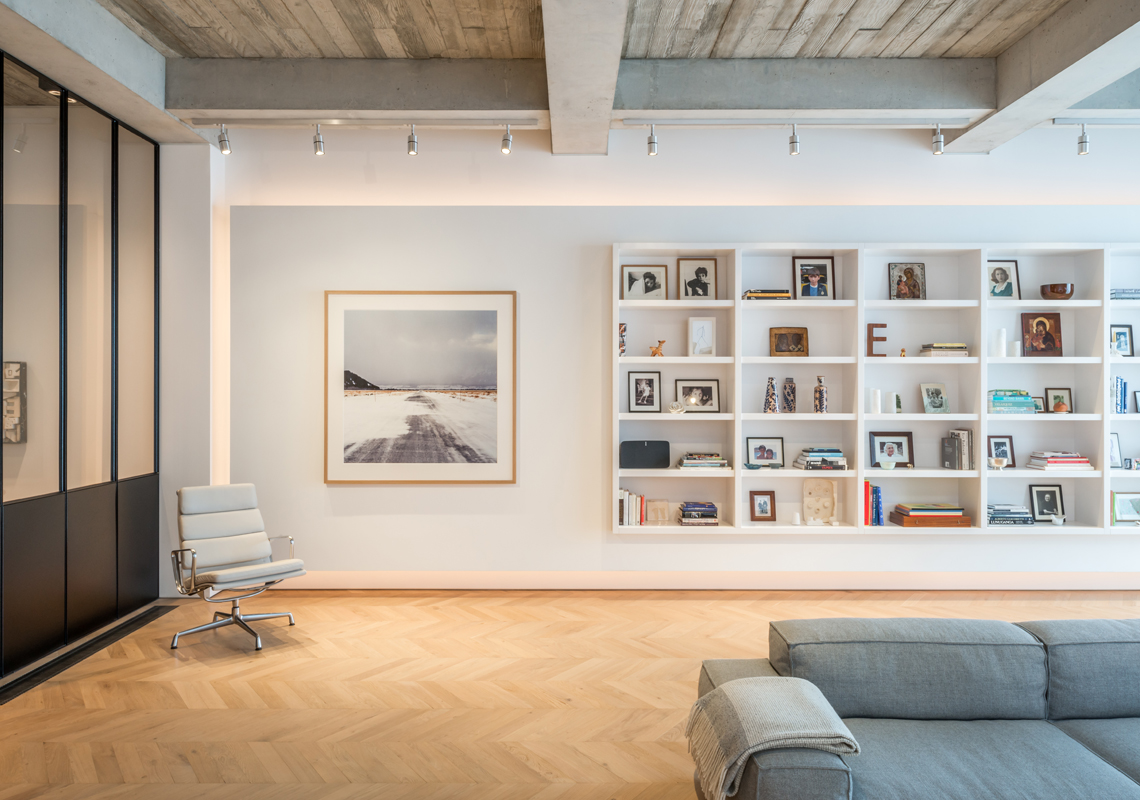 Function spotlights and concealed lighting compliment a wonderful choice of materials and the timeless muted colour palette. Our service from concept through to completion involved careful coordination with the architect and contractor to ensure cable runs and containment were precisely located within the board formed concrete ceiling high above floor level in the large volume basement space.