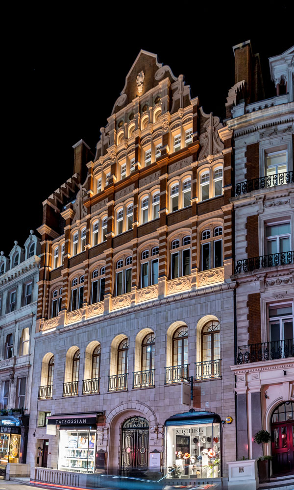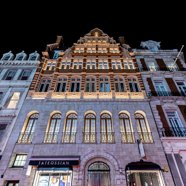 The lighting design studio were asked to provide a sympathetic and dynamic lighting scheme for this impressive commercial premises in the heart of Londons Mayfair.