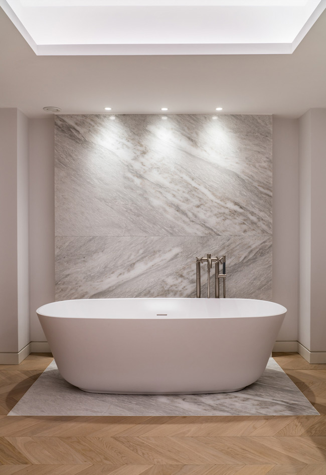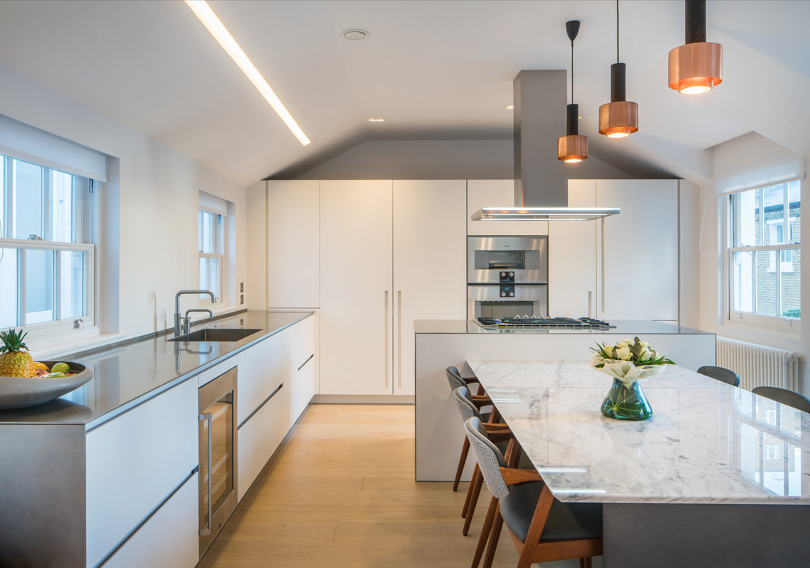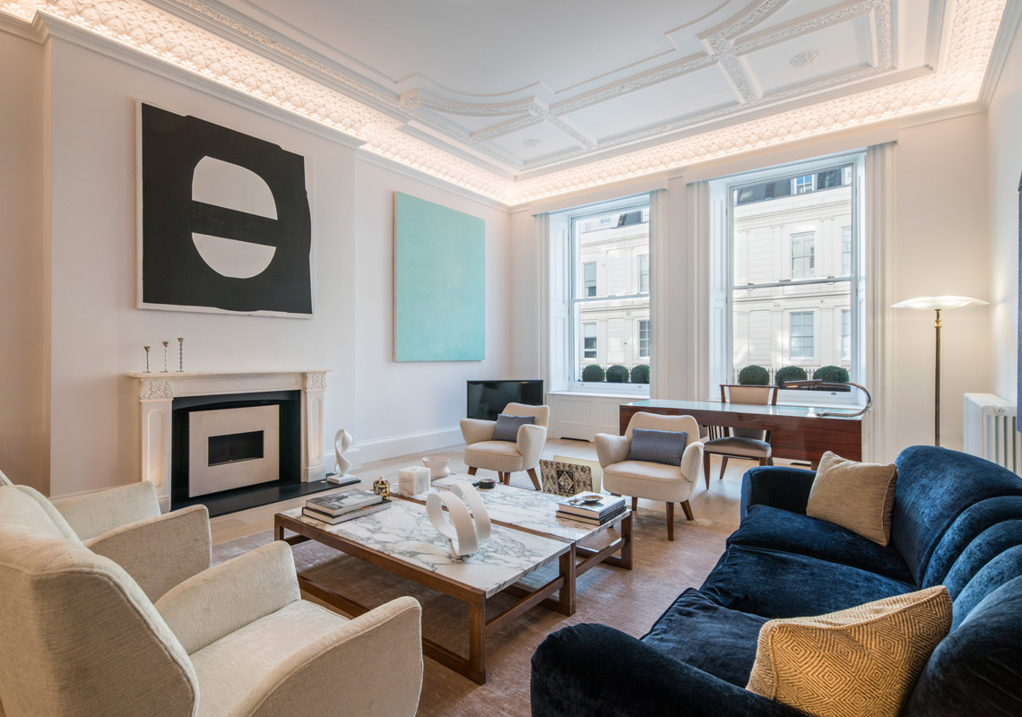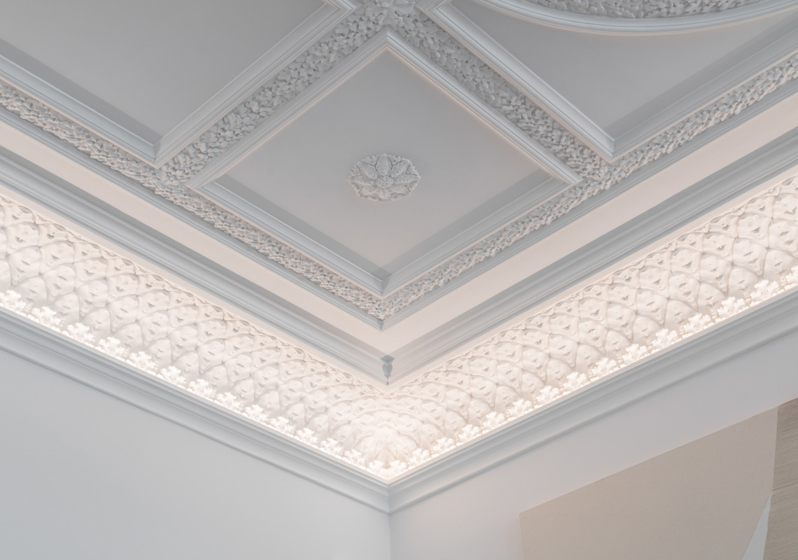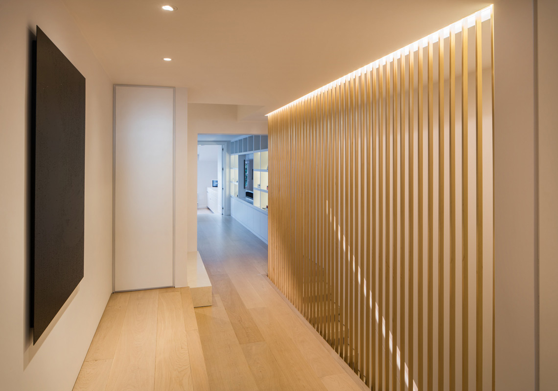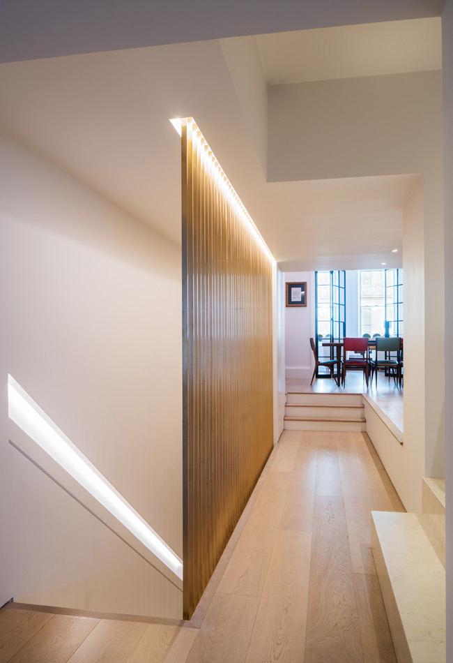 With LED lighting throughout and a smartphone-enabled lighting control system, the lighting scheme is extremely flexible and very energy efficient. Soft washes of light complement the original listed features in the grand reception rooms of this fabulous contemporary London flat.