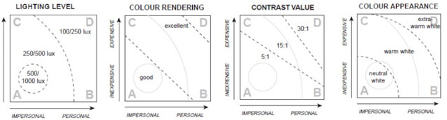 – BS EN 12464-1:2021, which provides the technical framework for illuminance, glare, and colour quality