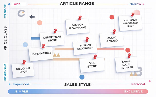 At its core, good retail lighting is about balance: between general lighting, feature lighting, and display lighting. That balance is not fixed; it depends heavily on the retail profile. A useful way to frame this is through A. van Gils’ four-corner retail design philosophy. Every shop sits somewhere on a spectrum, from inexpensive and impersonal with a wide product range (such as discount retailers or budget supermarkets), through to expensive, exclusive, and personal environments with a narrow product range (such as high-end fashion, jewellery, or technology brands).